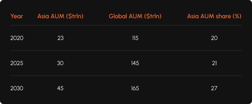 Asia is poised for a revolution in asset under management that will significantly boost the global fund management industry. By 2030, assets under management (AUM) in the region are projected to reach an impressive $45 trillion, representing nearly 30% of the global total. This substantial growth, lifting Asia’s current share from 18–20% — or $23 trillion — to just under 30% ($27 trillion), signals a structural shift in the management of the world’s capital.