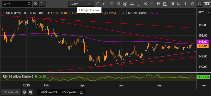 USDJPY has spent much of the past month consolidating in a broad range, but shifting fundamentals mean the final quarter of the year could deliver fresh direction. Since topping out just below 151.00 in early August, the pair has largely tracked between 146.00 and 149.00, with only a brief break lower following last week’s Fed meeting. Options traders with expiries around 147–148 would have found the environment particularly favourable, as the market repeatedly swung back into this mid-range zone.